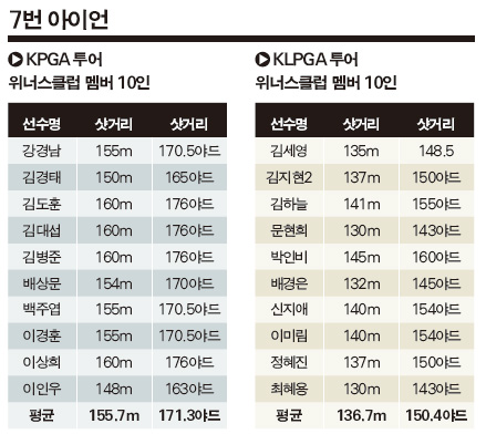 투어 프로들의 7번 아이언 평균 비거리