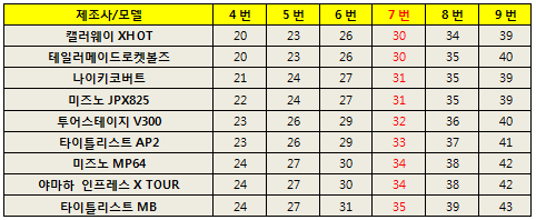 30. 클럽 간에 10m 내외의 비거리 차이가 나는 아이언세트의 로프트는 일반적으로 3, 4도 차이로 제작됩니다.