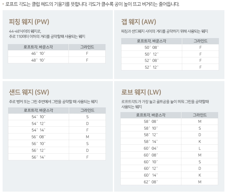 8. 여기에 로프트 각도 60도 이상의 로브웨지(LW)까지 크게 4종류로 나뉩니다.