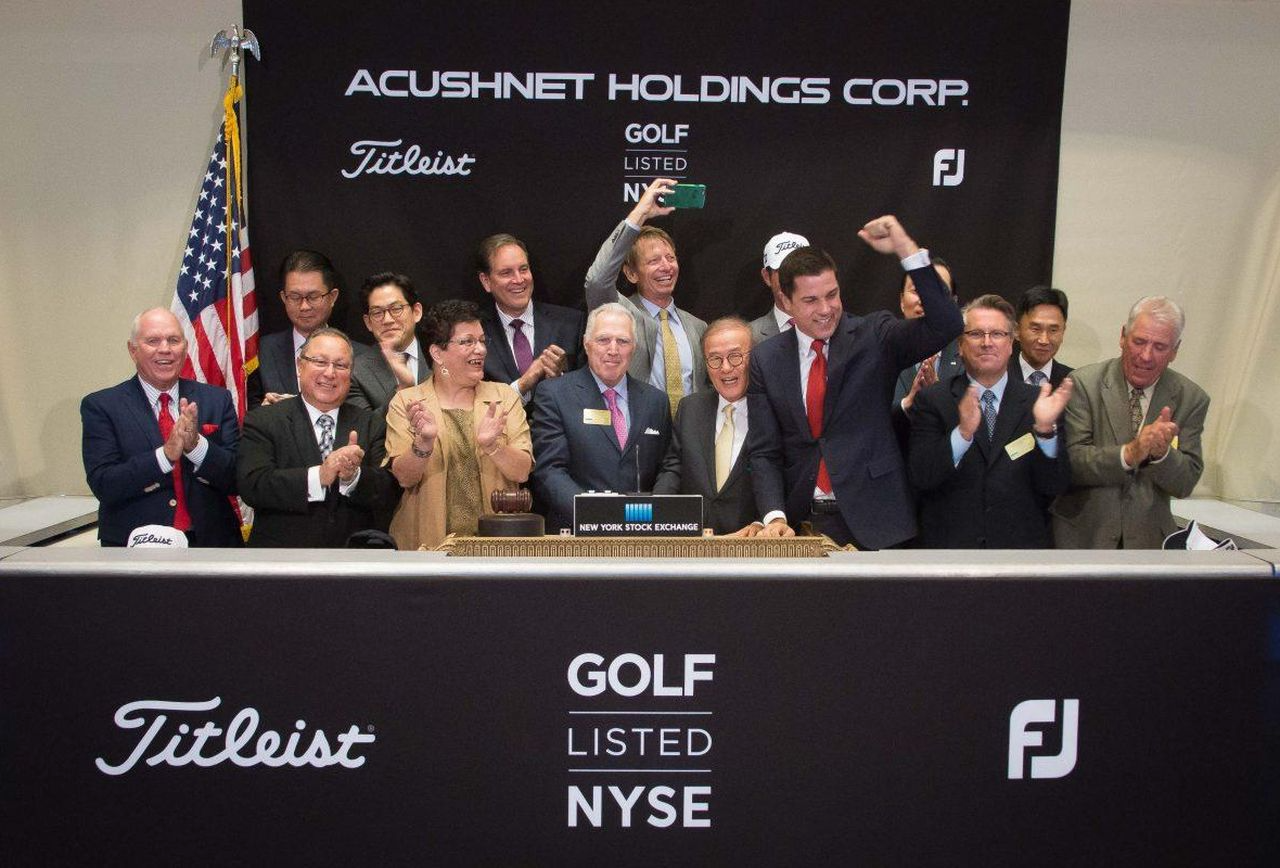 2016년 뉴욕 증시 상장식에 함께한 미국과 한국의 아쿠쉬네트 경영진 창사 이후 담배사업을 주력으로 하는 포춘 브랜드(Fortune Brands)에 한차례 인수합병되었던 아쿠쉬네트는 지난 2011년 휠라코리아와 미래에셋 사모펀드가 공동으로 당시 1조 3,000억을 투자해 지분 100%를 인수하면서 한국 기업의 자회사로 거듭나며 지금에 이릅니다. 이로써 세계 최고의 골프공 브랜드가 한국 기업의 소유가 된 것이죠.